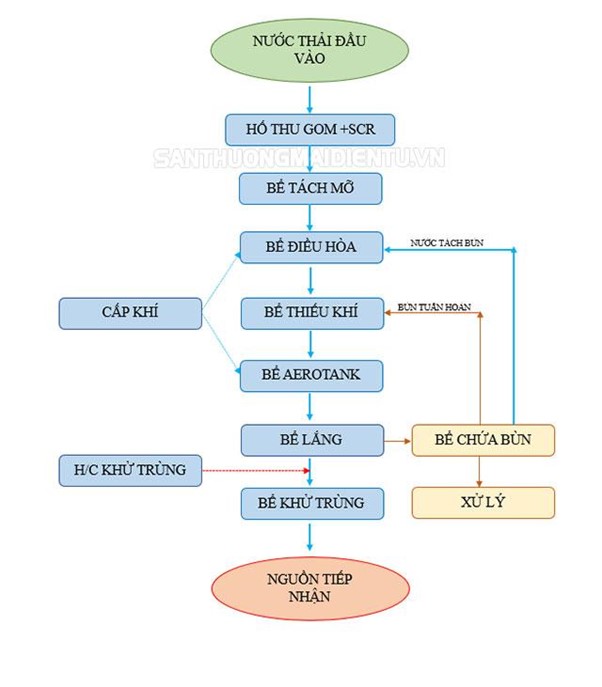 Bước 7: Bùn sau khi lắng xuống sẽ được bơm tuần hoàn về bể kỵ khí và thiếu khí để duy trì nồng độ vi sinh vật trong bể. Sau đó, phần bùn dư thừa được bơm về bể chứa bùn, toàn bộ lượng bùn đã qua xử lý được lưu trữ để các đơn vị chức năng thu gom xử lý.